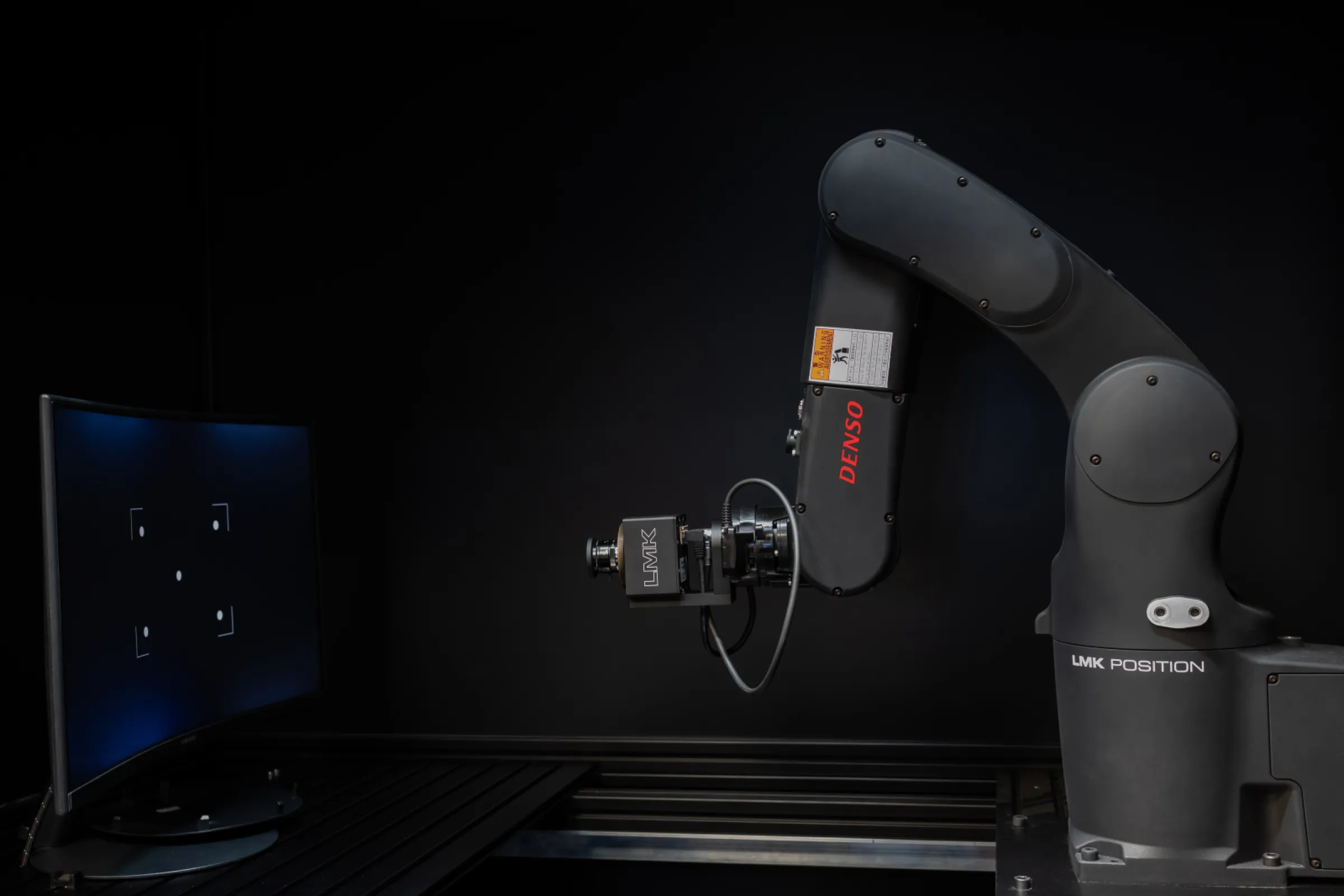 The LMK Position is a photometric robotic system combining LMK-based machine vision with the high precision and flexible movements of a 6-axis Denso VS industrial robot and, optionally, a JETI specbos spectroradiometer. It allows effective and cost-efficient accompanying measurements during research and development tasks and rapid small-series product testing of all kinds of display systems.